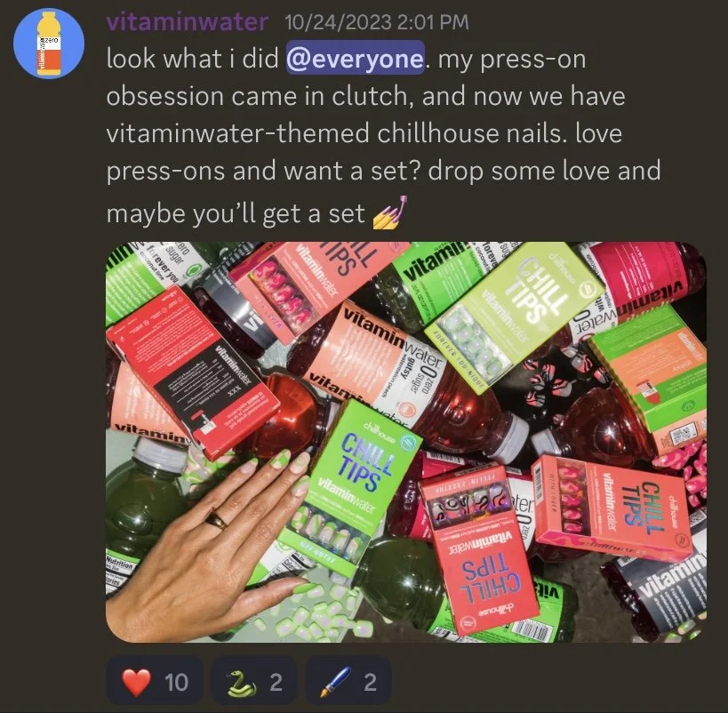 We engaged with posts about the partnership on Chillhouse’s owned channels, hyped up influencer content, posted about it on our own channels, dropped a unique S&D opportunity for our Discord wet_fam, and had an IRL event at the Chillhouse store in New York too!