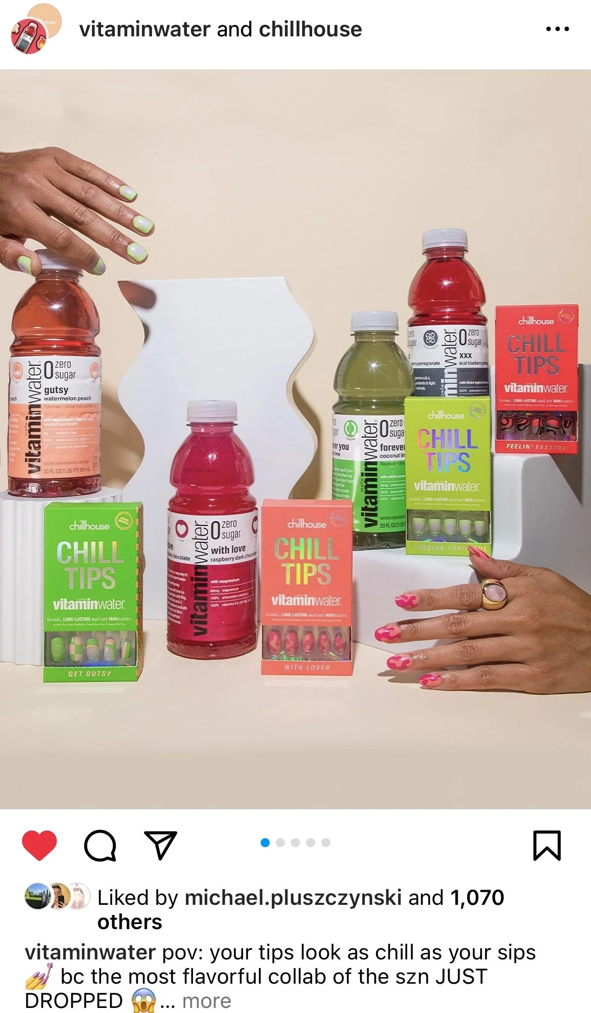 In 2023, the trend of men's nail art entered the mainstream. To nourish our Gen Z audience, who champions breaking free of gender norms, we collaborated with self-care destination, Chillhouse, to create a press-on nail collection with eclectic designs and packaging for anyone, inspired by four vitaminwater SKU’s.